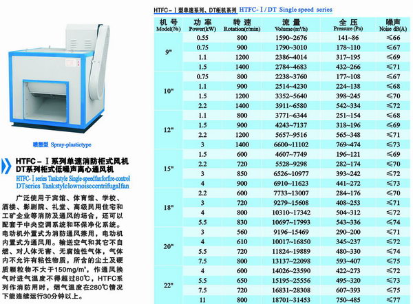 HTFC離心式消防系列風機用于體育館,地下停車場,學校,酒樓,商場,大型住宅區(qū)等消防能風場所,平時作普通通風用,發(fā)生火災時作消防排煙用時能在280℃高溫條件下連續(xù)運行30分鐘以上不損壞 。